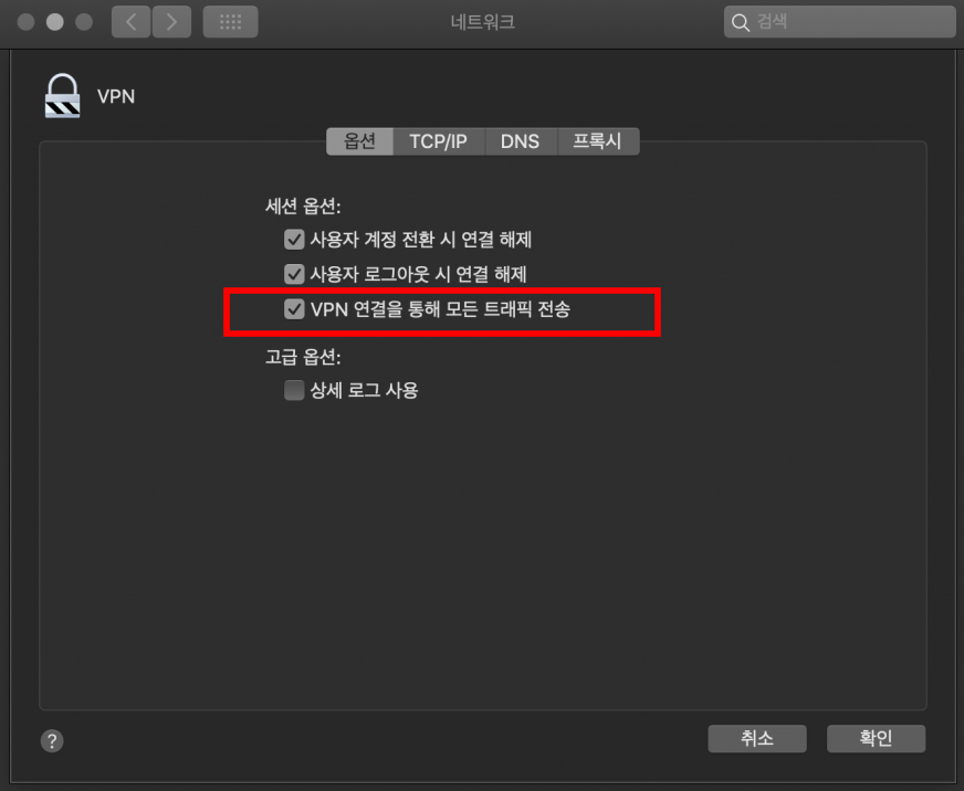 9. 옵션 에서 꼭 VPN연결을 통해 모든 트래픽 전송이 체크 되어있는 지 확인 해주세요.